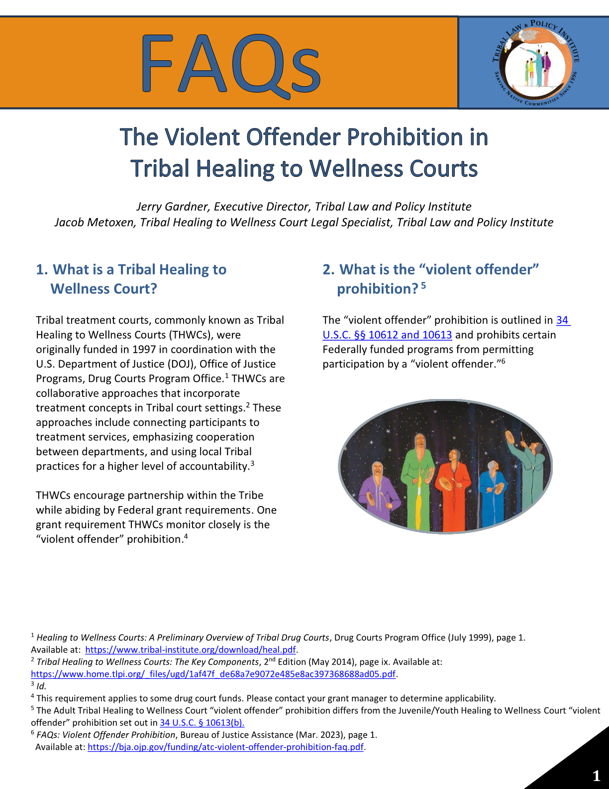 FAQs The Violent Offender Prohibition in Tribal Healing to Wellness Courts (2025). The “violent offender” prohibition is one of the more complex eligibility requirements tied to federal funding streams.  This Frequently Asked Questions (FAQ) publication provides an in-depth explanation of the “violent offender” prohibition as it pertains to Tribal Healing to Wellness Courts — offering practitioners an accessible tool for navigating the prohibition. By breaking down statutory language and translating the law into understandable guidance, the publication provides readers with the necessary information to help make eligibility determinations, maintain compliance with federal grant conditions, and document decision analysis.  Overall, this resource utilizes frequently asked questions to support Tribal Healing to Wellness Courts in their goal to strengthen programming and ensure opportunities rooted in culture remain accessible within federal guidelines.